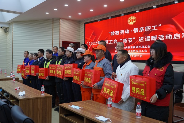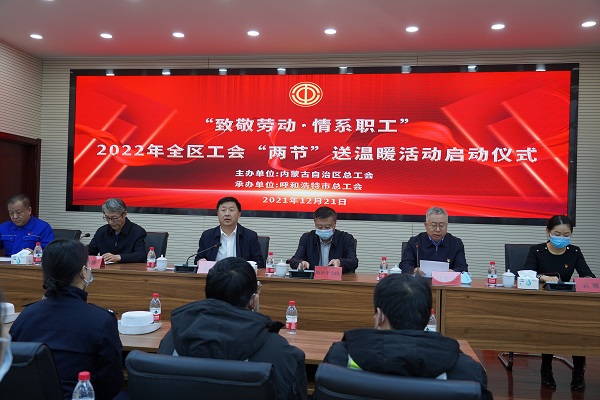 為深入貫徹黨的十九屆六中全會(huì )精神和自治區第十一次黨代會(huì )精神,不斷深化"我為群眾辦實(shí)事"實(shí)踐活動(dòng)成果。12月21日上午,以"致敬勞動(dòng)情系職工"為主題的2022年全區工會(huì )"兩節"送溫暖活動(dòng)啟動(dòng)儀式在城發(fā)橋靠分公司舉行,儀式上為來(lái)自供熱、環(huán)衛、快遞、交警、公交及疫情防控、社區等各行各業(yè)的近50名一線(xiàn)職工代表發(fā)放慰問(wèn)品,送上黨和政府的關(guān)懷、工會(huì )組織的溫暖。呼市總工會(huì )黨組書(shū)記、副主席汪俊亭主持啟動(dòng)儀式。