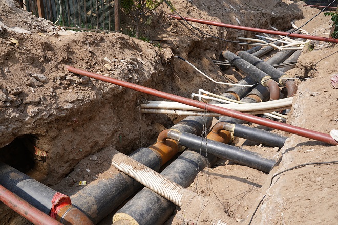 在開(kāi)天花園小區熱力站供熱管線(xiàn)出口區域,兩名工人師傅正在清理現場(chǎng)的供熱管線(xiàn)?,F場(chǎng)看到管溝內鋪設的主管線(xiàn)、與樓宇的抽頭安裝已全部完工,溝內自來(lái)水管線(xiàn)、污水管線(xiàn)、弱電管線(xiàn)、強電管線(xiàn)縱橫交錯。