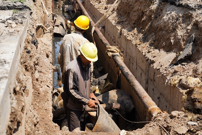 據施工方介紹,"該小區供熱管線(xiàn)總長(cháng)約7000米,供熱管道因長(cháng)期浸泡在污水中,腐蝕嚴重。如意小區分A、B、C三個(gè)區,還有東西商網(wǎng),目前僅僅B區的供熱管溝內污水較少,A、C兩個(gè)區、東西商網(wǎng)的地溝內幾乎全部是污水,最深的管溝內深度達到了近1.2米,給施工增加了難度。每天早上開(kāi)始用三臺泵抽排污水,中午休息1個(gè)半小時(shí)后,開(kāi)始施工時(shí),溝內又有了污水。尤其是經(jīng)過(guò)一晚上的停工,第二天溝內污水深度又達到了1米多。為確保工期,不影響按期供暖,目前采取分段式施工方案,先抽干地溝中的污水,再進(jìn)行管道更換。三伏天,工人師傅們穿著(zhù)連體防水服,忍受著(zhù)刺鼻的氣味,在污水深達一米多的地溝內,一泡就是一天。施工至今已近二個(gè)月,每一天他們都是這樣重復著(zhù)工作,清理不斷涌出的污水,拆除舊管,鋪設新管,一天的工作后,打濕衣服的不只是污水還有汗水。"