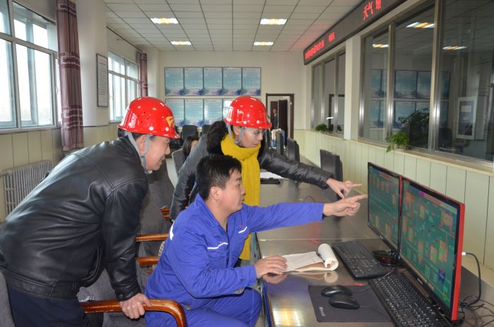 城發(fā)公司董事長(cháng)張瑞平在橋靠司爐車(chē)間給環(huán)保局領(lǐng)導講解脫硫情況